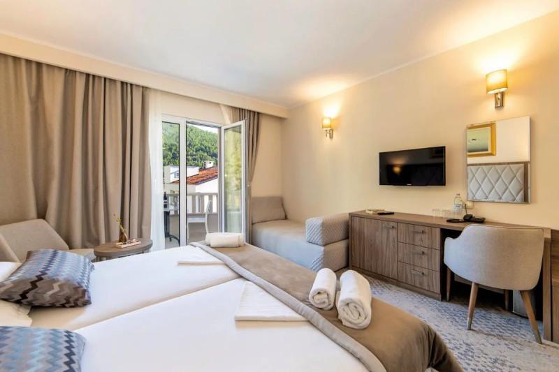 | Dvoulůžkové pokoje s možností přistýlky mají TV, telefon, Wi-Fi připojení, klimatizaci, minibar (za poplatek), trezor, koupelnu s WC a vysoušečem vlasů, balkon s posezením orientovaným do okolí. Za příplatek na vyžádání je možno pokoje s výhledem na moře, pokoje deluxe s výhledem do okolí. Případně pokoje economy v podkroví v 5.patře (na vyžádání za sníženou cenu). |