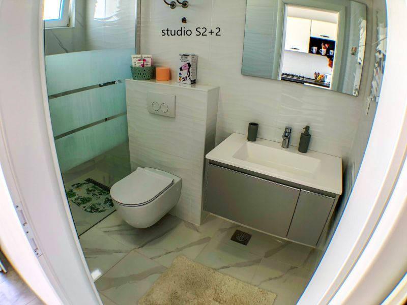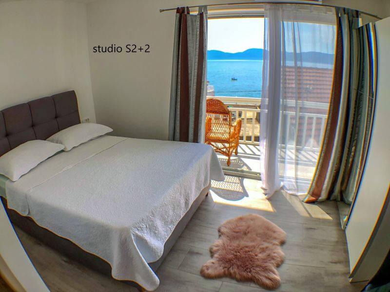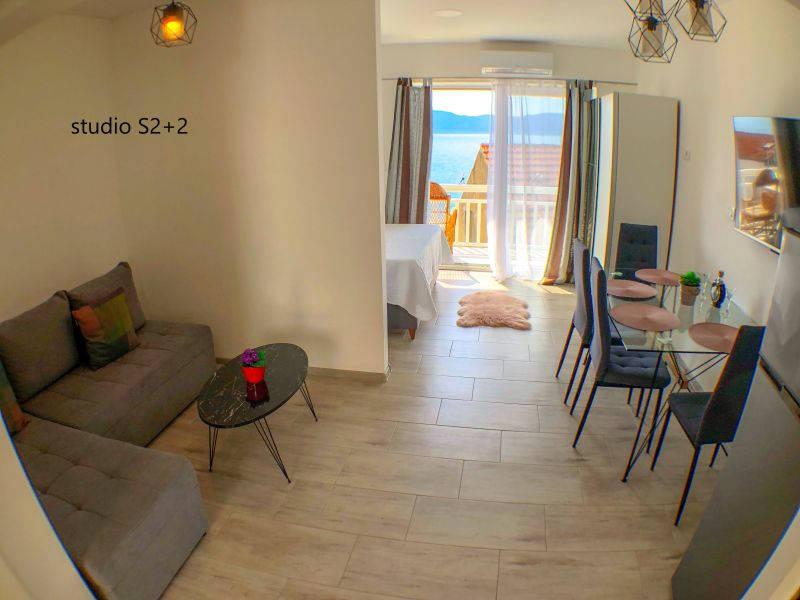 TV, klimatizace a balkon. S2+2: 2-lůžkový pokoj s gaučem na rozložení pro 2 děti do 12 let nebo 1 dospělou osobu a kuchyňským koutem, hyg. zařízení, SAT TV, klimatizace a balkon. |